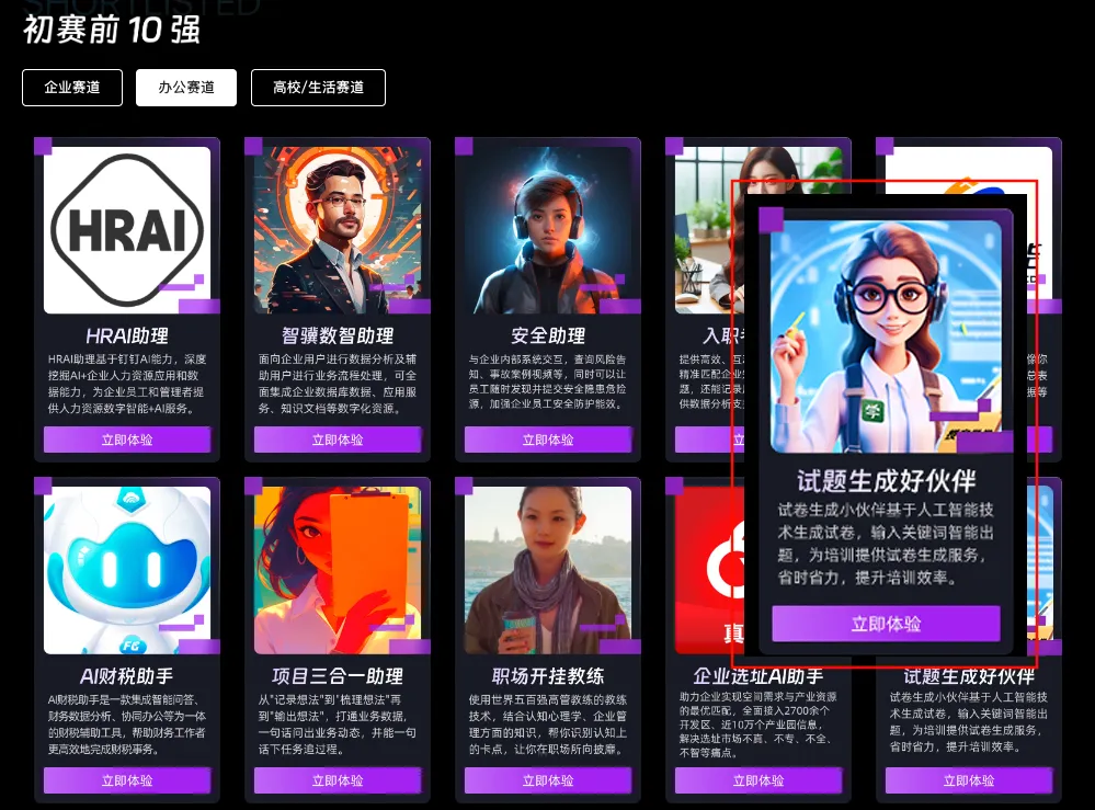 本次大赛中,授客学堂技术团队凭借深厚的人工智能技术底蕴与10余年积累的用户行为、学习内容等数据资源,深度融合钉钉AI开放平台,推出了涵盖多领域、多功能的12款AI助理产品阵容,致力于全方位提升个人与企业的学习培训效率。