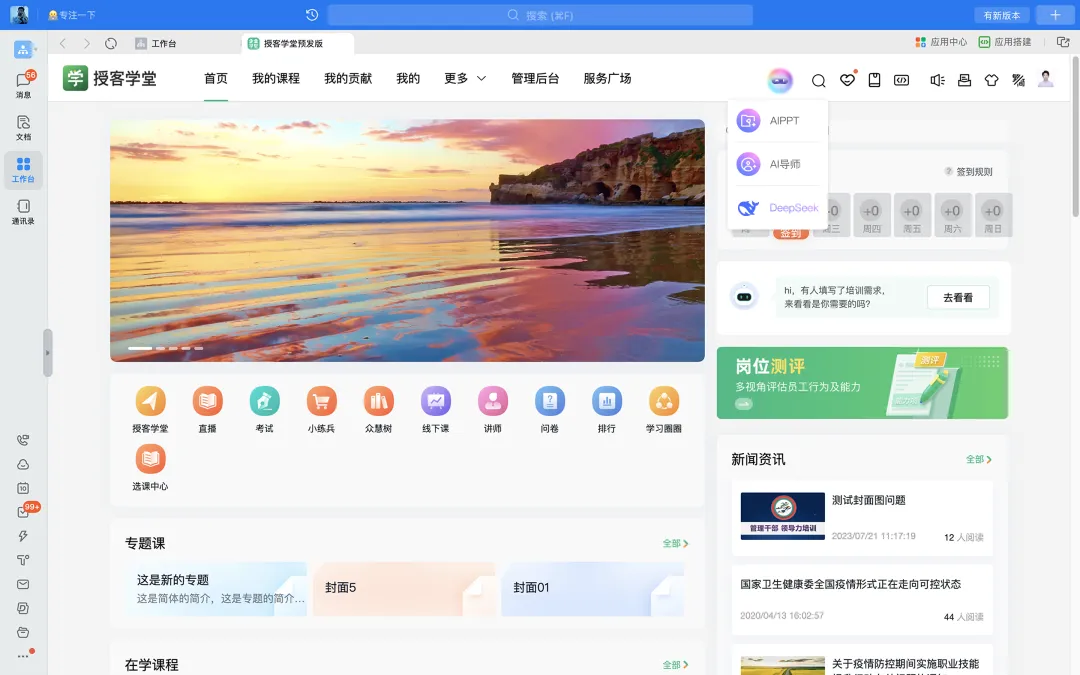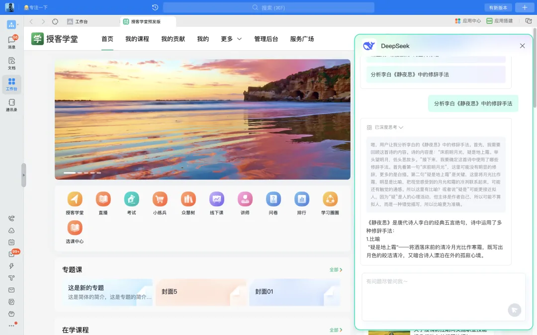 授客学堂通过在学习平台首页内置DeepSeek,让DeepSeek成为每一位学员的专属AI学习助手。学员可在平台首页一键唤醒DeepSeek进行智能交流,从而满足智能问答、内容生成、资料分析等多样化学习需求。