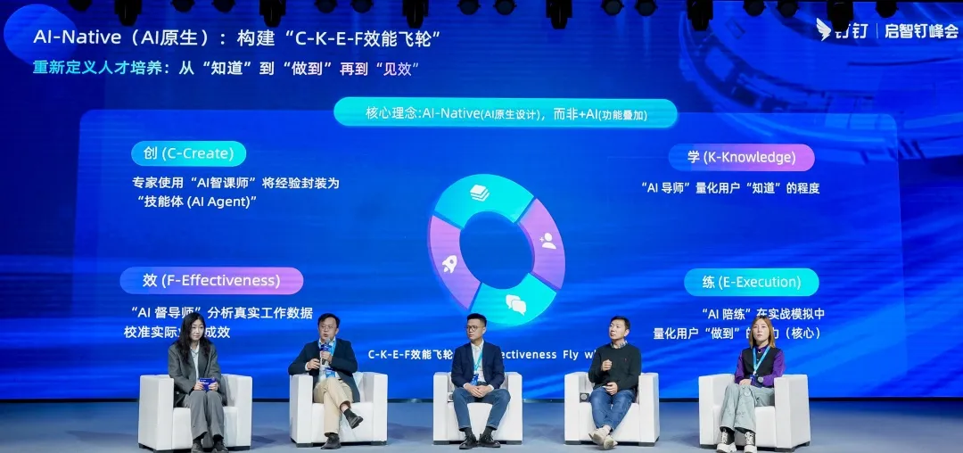 钉学科技CEO、授客AI创始人张晓华受邀登台,在圆桌论坛发表主题观点,深入剖析了AI时代企业培训面临的挑战与机遇,并提出了创新的解决方案——C-K-E-F效能飞轮,引发行业共鸣。
