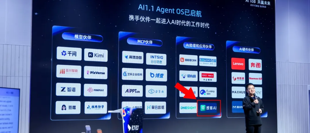 旗下核心产品授客AI以AI助理与应用伙伴、DingTalk A1深度融合伙伴的身份亮相生态体系;同时,全新发布的授客AI教练产品也在本次大会节点同期上线,正式进入钉钉AI生态核心舞台。