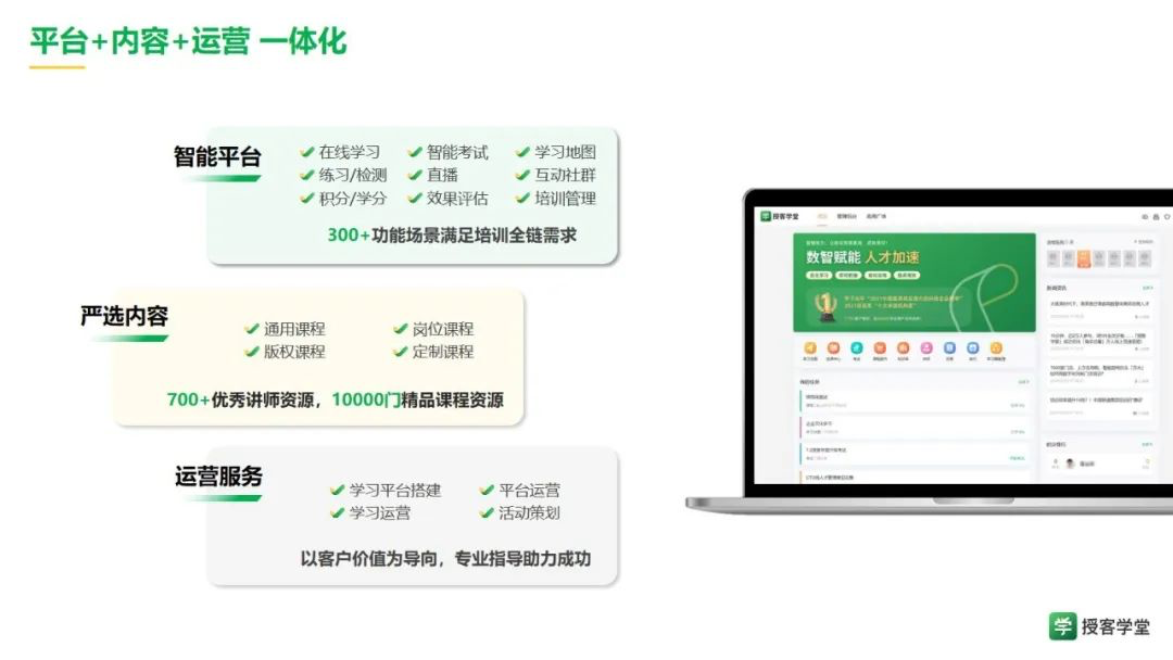 钉学科技旗下拥有“授客学堂”“赋能学院”“政务强学”“转正快”四款数智化人才培养SaaS应用,围绕人才的“选育用留”,通过上百个功能模块、300+功能场景,更深融入、灵活支持各行业组织培训个性化场景。在行业内形成了“培训融入业务、模块灵活配置、场景深度支持”的产品优势。