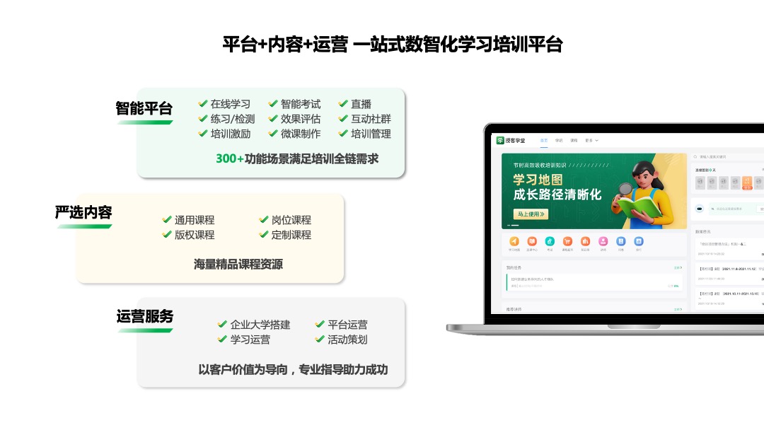 授客学堂,是数智化企业培训和人才发展平台,通过SaaS工具+内容+运营服务,帮助企业解决人才复制难、专业能力差、培养周期长、业绩提升慢等痛点,实现高绩效人才的快速培养和复制。